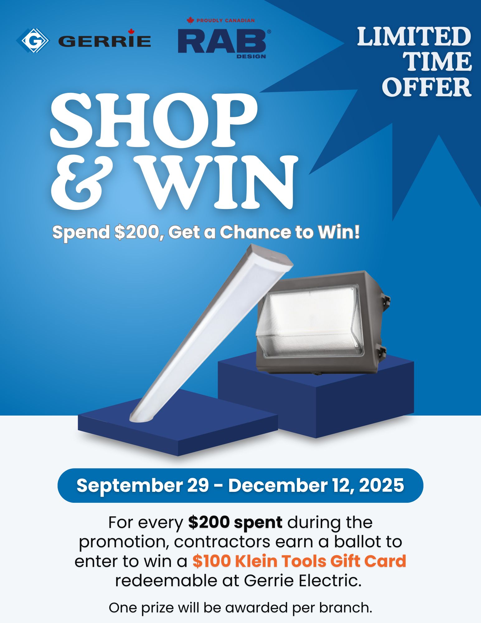 For every $200 spent during the promotion, earn a ballot to enter to win a $100 Klein Tools Gift Card redeemable at Gerrie Electric!